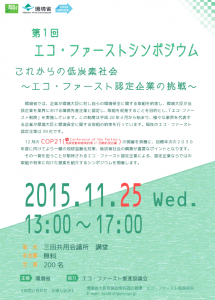平成27年11月25日開催環境省は、12月に開催されるCOP21に先駆けて第1回「エコ・ファーストシンポジウム」を平成27年11月25日に開催することを発表した。