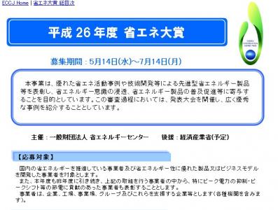 省エネ意識の浸透、省エネ製品の普及促進に寄与一般財団法人省エネルギーセンターが平成26年度省エネ大賞の募集を開始した。